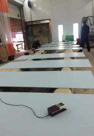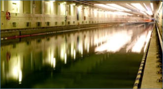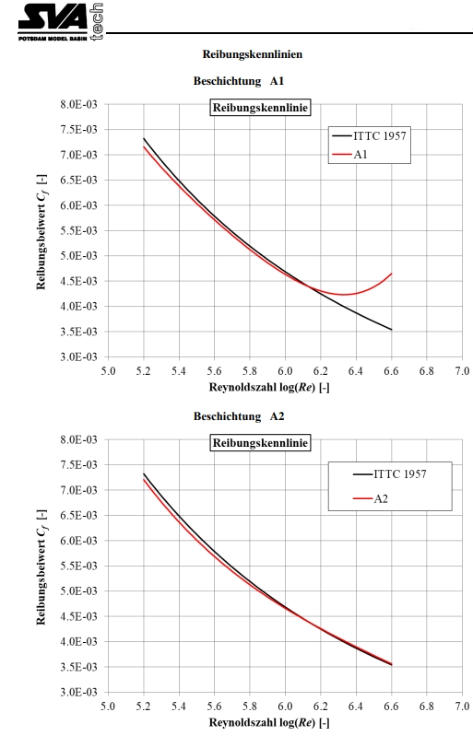 SVAhasafrictiontunnel(seethepicturebelow).Inthetestsectionof thisfacility(theblackpartinthepicture)twoflatand1.2mlongpanels areinstalledsothattheseformanarrowrectangularchannel.The panelsarecoatedwiththecoatingotobeinvestigated(withorwithout DephySkin®).Thetunnelistraversedbywaterwithaspeedof1to17 m/sin19steps.Bythesimultaneousmeasurementoftheflowrate andthepressurelossmeasuredat12positionsalongthetestsection, thewallshearstresscanbedetectedandfinallythefrictional resistancecoefficientofthesurfaceiscalculated.Thetestprocedure foronepairofplateincludes1hconditioningofthetestfacilityand 2.5hmeasuringofonecoating.Eachmeasurementconsistsof3runs thatareaveraged.Theresultsareplottedasfrictionresistance coefficientsindependencyoftheReynoldsnumber,whichisan equivalentexpressionfortheflowspeed.Measurementswith referenceplates(smoothstainlesssteel)atthebeginningandtheend of the measurement campaign help to classify the results.