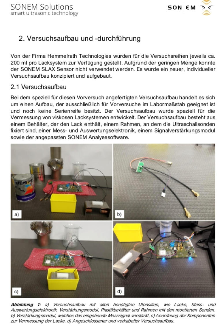 Experimental setup and executionThetestseriesweremadeavailablebyHemmelrathTechnologies,approx.200mlperpaintsystem. Duetothesmallquantity,theSONEMSLAXsensorcouldnotbeused.Anew,individualtestsetup was designed and built.The experimental setupThetestsetupspeciallymadeforthispreliminarytestisasetupthatisonlysuitableforpreliminarytestsona laboratoryscaleandisnotyetreadyforseriesproduction.Thetestsetupwasspeciallydevelopedformeasuring viscouspaintsystems.Theexperimentalsetupconsistsofacontainercontainingthepaint,aframetowhichthe ultrasonicprobesarefixed,measurementandevaluationelectronics,asignalamplificationmoduleandthe adapted SONEM analysissoftware