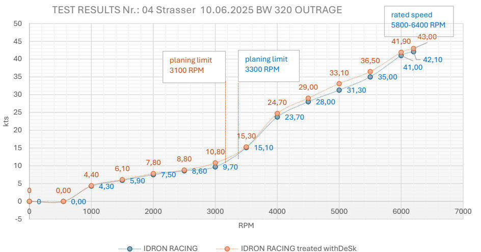 Summary ofthe testresult:10/06/2025 in TRIEST – BaiadiTriesteEach test runwas repeated 3 times,andthe averagewas recorded.BostonWhaler,320Outrage,Weight(including engines) 4430kg, Engine:2xVerado 275CXXL,202 kW (275hp) Length 10.80 mWidth3.09m Depth 0.55mMeasured by GPS,threepeople onboard, 600l offuel, shallow water,no wind(2kts), smallconstant ocean current in the samedirection.1.Test09:00 Shortsurface grinding,new paintedsprayed with Micron 3502.Test14:00 Shortsurface grinding,paintedover sprayed with Micron350 treated with DelphySkin®